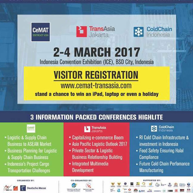 CeMAT South East Asia 2017 will be held at Indonesia Convention Exhibition (ICE) BSD City on 2-4 March 2017. This exhibition will give the chance for companies to meet an end-to-end supply chain & new business solution for intralogistic, external transportation & logistic, and specialty logistic. For more information: www.cemat-sea.com
