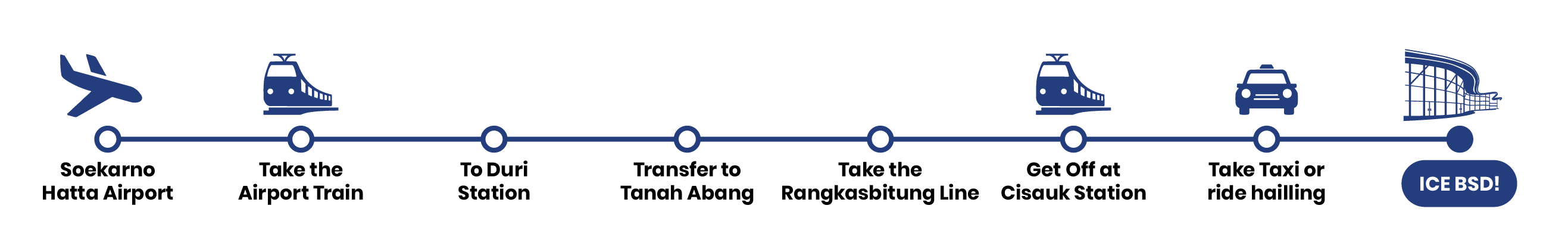 From Tanah Abang Station, take the Rangkasbitung Line toward Parung Panjang or Rangkasbitung, and alight at Cisauk Station. Continue your journey to ICE BSD only 5 minutes via the BSD Link shuttle or ride-hailing services.