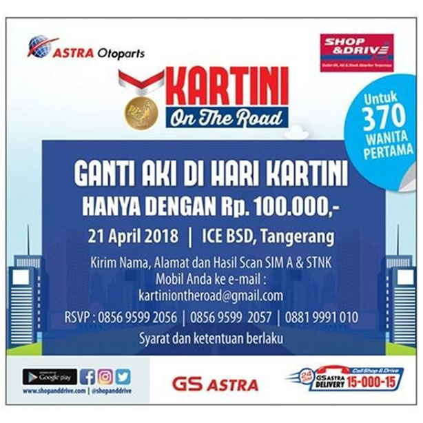 Be the 370 women who were selected to break the Muri Record: Most Car Battery Replacement on April 21, 2018 at the Indonesia Convention Exhibition (ICE) BSD City, Tangerang. For you motorists: Toyota: Avanza, Vios, Yaris, Rush, Agya, Calya Daihatsu: Xenia, Terios, Sigra, Ayla Honda: Brio, Mobilio, City, BRV Suzuki: Ertiga, Swift, Xover Register yourself immediately! Send your name, address, and the scan result / photo of your SIM A & STNK to email: kartiniontheroad@gmail.com