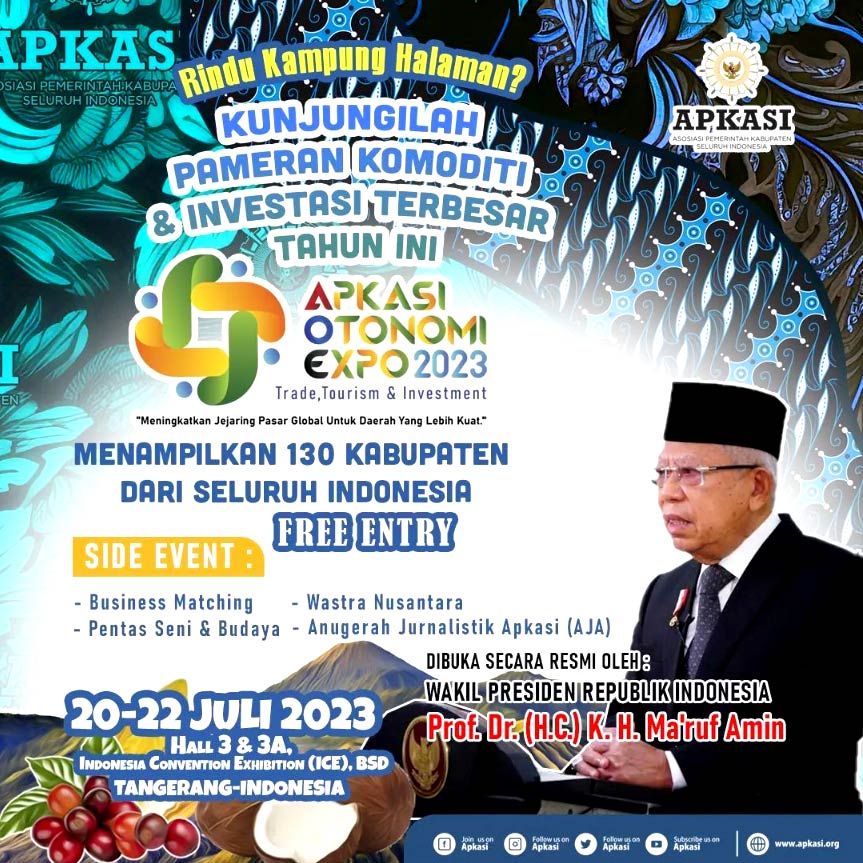 Wakil Presiden Ma’ruf Amin dijadwalkan membuka kegiatan Rapat Kerja Nasional Asosiasi Pemerintah Kabupaten Seluruh Indonesia (Rakernas Apkasi) dan Pameran Apkasi Otonomi Expo (AOE) 2023, Kamis (20/07/2023) di Nusantara Hall ICE BSD, Kabupaten Tangerang.